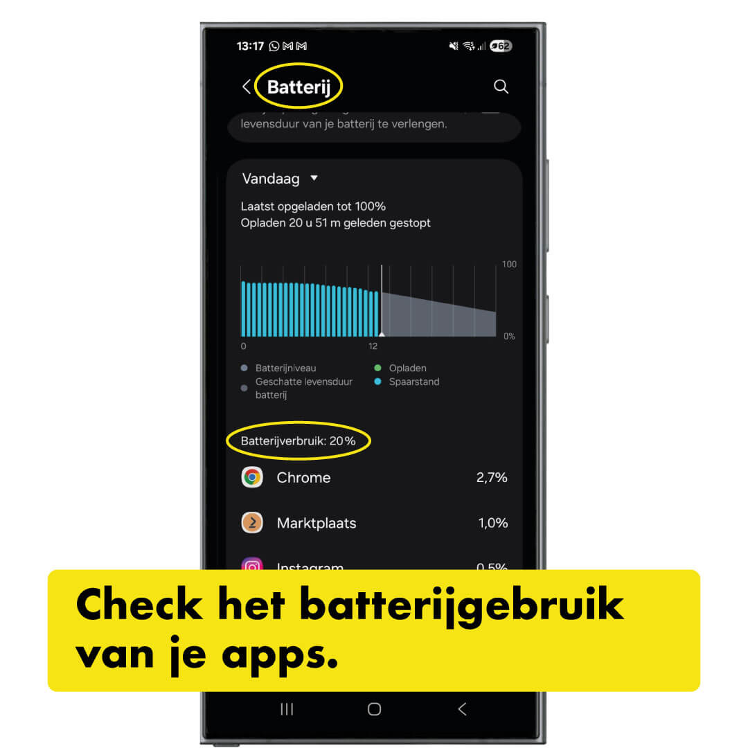 Trouver la bonne solution commence par déterminer d'où vient le problème. Va dans les paramètres de batterie de ton téléphone Samsung et observe quelles applications consomment le plus. Assure-toi que tout est à jour, limite les notifications et les données en arrière-plan ou supprime les applications dont tu n'as plus besoin. Tu peux aussi laisser ton Samsung faire le travail pour toi. Dans le même écran, tu peux toucher ‘Optimiser maintenant’. Cela fermera automatiquement toutes les applications actives en arrière-plan et résoudra d'autres petits problèmes.