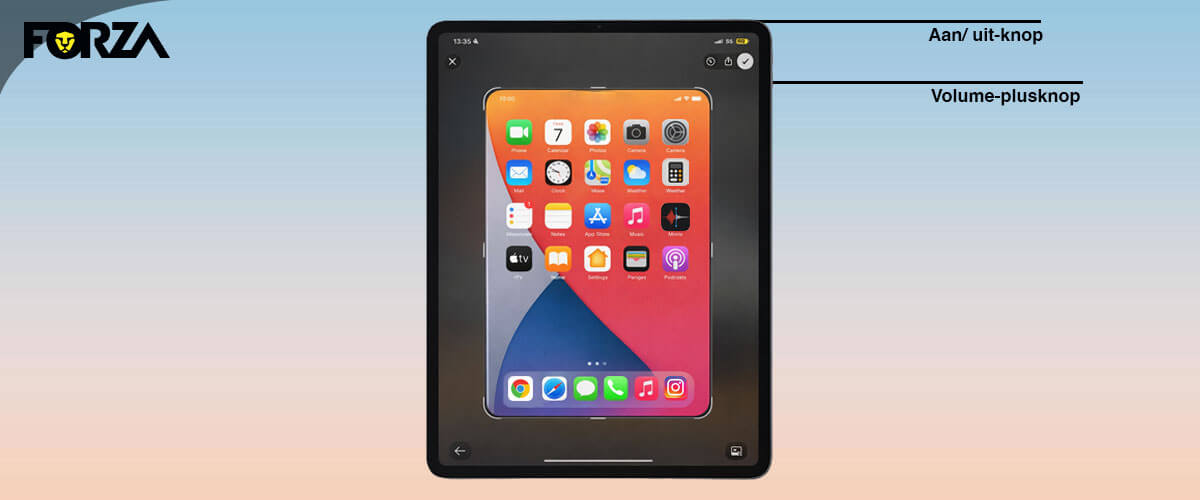 Sommige iPads hebben geen thuisknop meer. Met dit soort iPads maak je een screenshot door de volume-plusknop en de aan/uit-knop te gebruiken. Houd er rekening mee dat de volumeknoppen bij deze iPads aan de rechterkant zitten.