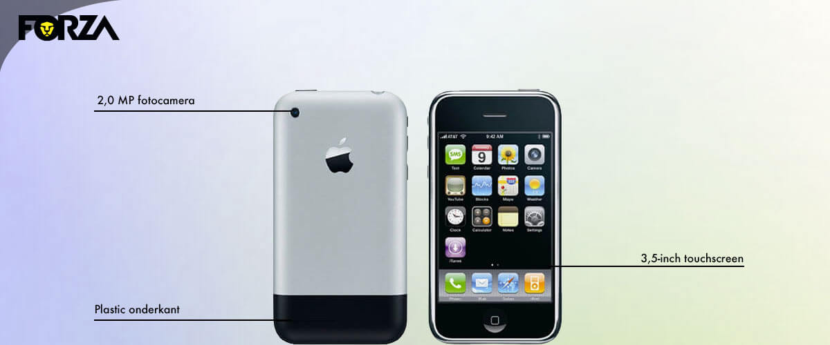 Wanneer kwam de eerste iPhone uit? Het begon allemaal in 2007 toen de wereld op zijn kop werd gezet. Apple introduceert de iPhone 2G: een iPod, revolutionaire telefoon en een baanbrekende toestel met internet in één! Het 3,5-inch touchscreen, de 2-MP fotocamera en 4GB/8GB wat later 16GB opslagruimte werd maken dit toestel uniek. De plastic strip aan de onderkant zorgt ervoor dat de eerste iPhone kan zenden én ontvangen.