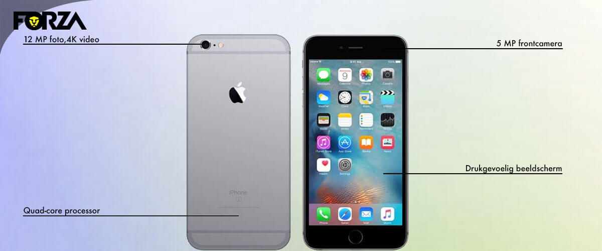 De iPhone 6S is de opvolger van de iPhone 6. De verschillen tussen beide toestellen zijn klein, al is de camera wel enorm verbeterd. Voor het eerst kun je 12 MP foto’s maken en filmen in 4K, wat vier keer beter is dan Full-HD! Ook de frontcamera is flink verbeterd naar 5-MP, waardoor selfies en videobellen er meteen veel beter uitzien. Het 4,7-inch beeldscherm is voor het eerst drukgevoelig. Deze 3D-Touch-functie wordt tot op heden (en een soort gelijke functie) nog steeds gebruikt.