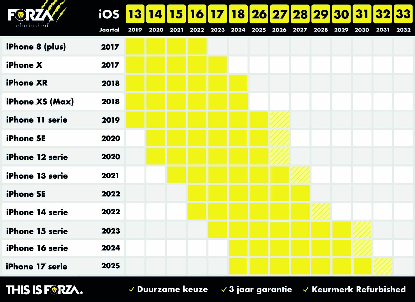 Bijvoorbeeld: de iPhone SE 2020 refurbished is uitgebracht in 2020 en zal tot en met (+6) september 2026 van de laatste iOS versie genieten. Let wel: dit is een verwachting gebaseerd op het software-uitrol-gedrag zoals we gewend zijn van Apple. Vooralsnog klopt deze voorspelling altijd. Een enkele keer wijkt het af. Zo was voorheen 5 jaar iOS-ondersteuning waar nu 6 jaar de maatstaf geworden.