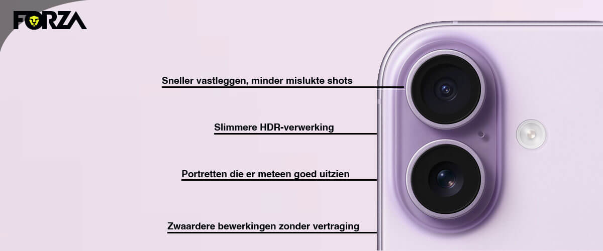- 16-core Neural Engine: dit is het gedeelte dat de iPhone 17 “slim” maakt. Het zorgt ervoor dat de iPhone 17 verschillende taken kan uitvoeren. Dit zijn taken zoals foto’s automatisch verbeteren, tekst herkennen in foto’s en onderwerpen/gezichten herkennen.