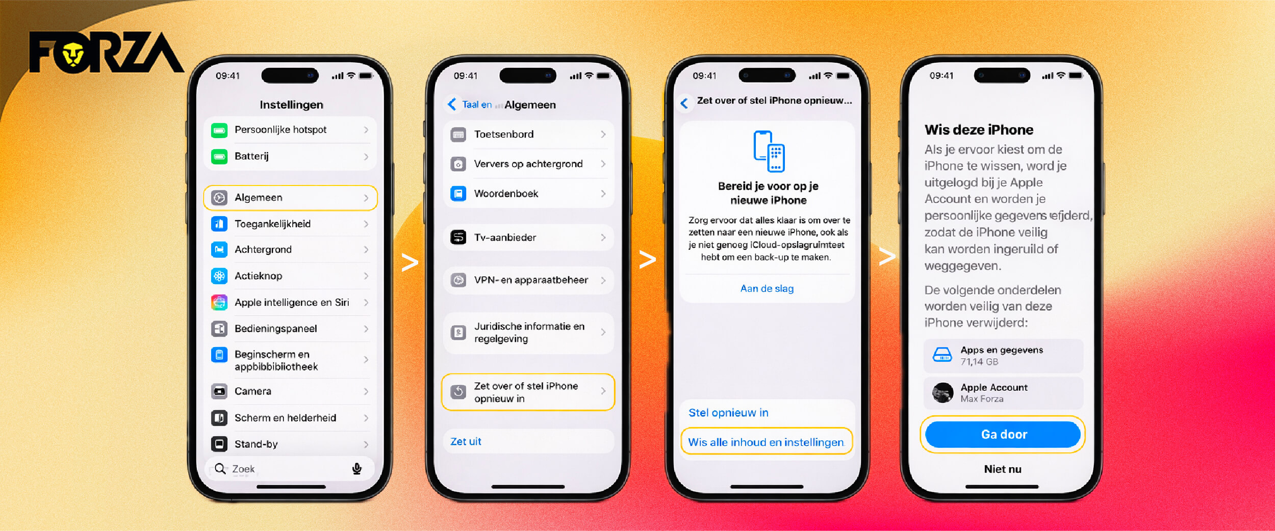 Het is een goed idee om je iPhone te resetten als je hem gaat verkopen, inruilen of weggeven. Zeker als je wil dat het toestel volledig leeg is. Ook bij hardnekkige vastlopers, traagheid of apps die blijven crashen kan een reset helpen. Dan gaat je iPhone terug naar de fabrieksinstellingen. En stap je over naar een nieuwe iPhone? En wil je die dan, bijvoorbeeld bij Forza, inruilen dan is resetten de veiligste manier om je oude toestel netjes op te leveren. Zonder dat er nog persoonlijke data of je Apple ID gekoppeld blijft.